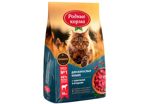 Родные Корма Сухой корм для взрослых кошек с Телятиной и ягодами 10 кг