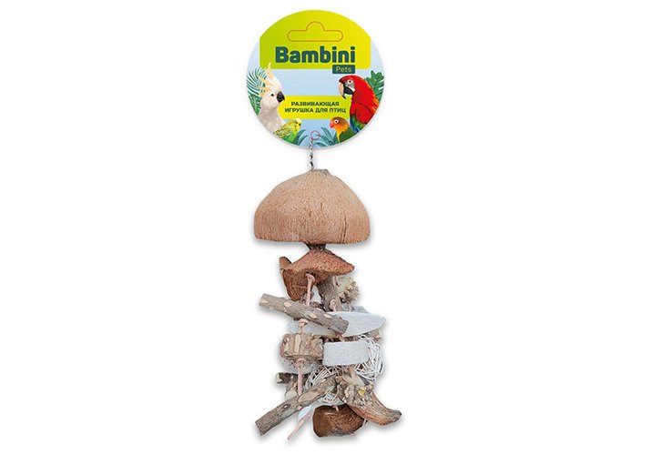 Уникальный дизайн из натуральных материалов, таких как скорлупа кокоса, сепия, люфа и ореховое дерево, придает игрушке особый шарм и привлекает внимание вашего питомца.
