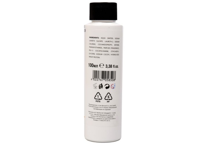 Состав: вода, лаурет сульфат натрия, лаурет-2, хлорид натрия, кокамидопропил бетаин, феноксиэтанол, парфюм (отдушка), ПЭГ-15 кокополиамин, этилгексилглицерин, натрия кокоил гидролизованный пшеничный протеин.