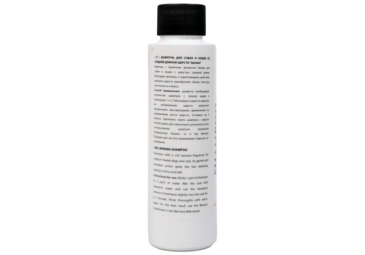 Шампунь с приятным ароматом банана для собак и кошек с шерстью средней длины. Благодаря нежному и укрепляющему действию шампуня, шерсть приобретает эластичность и блеск.