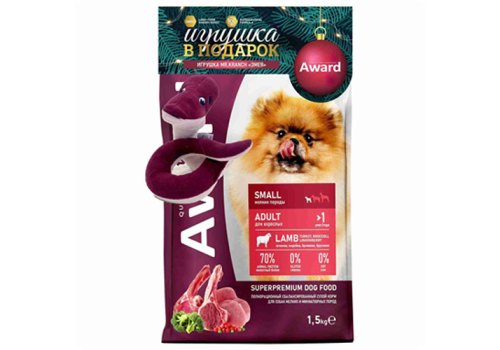 1. Сухой корм AWARD для взрослых собак мелких и миниатюрных пород с ягненком и индейкой с добавлением брокколи и брусники 1,5 кг.