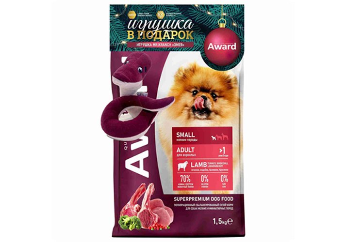 Новогодний комплект сухого корма суперпремиум-класса бренда “Award” для взрослых собак мелких и миниатюрных пород с ягненком и индейкой и игрушки Змейка бренда “Mr. Kranch“ в стильном фиолетовом цвете станет волшебным подарком любимому питомцу.