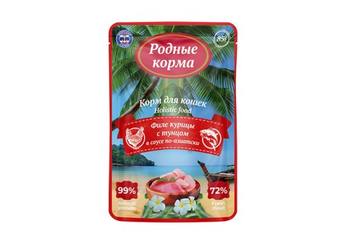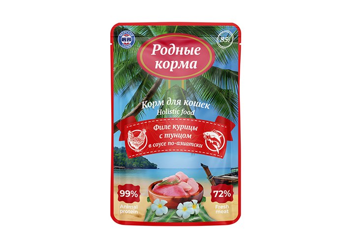 Родные Корма Паучи Морская серия для Кошек филе Курицы с Тунцом в соусе по-Азиатски (цена за упаковку) 85г х 12шт