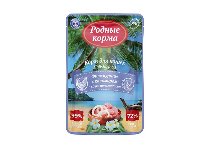 Родные Корма Паучи Морская серия для Кошек филе Курицы с Кальмаром в соусе по-Азиатски (цена за упаковку) 85г х 12шт