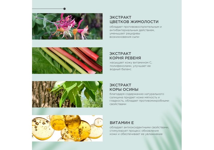 Экстракт цветков жимолости: обладает противовоспалительным и антибактериальным действием, уменьшает рецидивы возникновения сыпи.