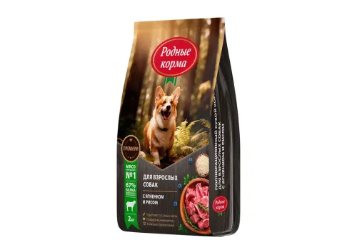 Родные Корма Сухой корм для взрослых собак с Ягненком и рисом 2 кг