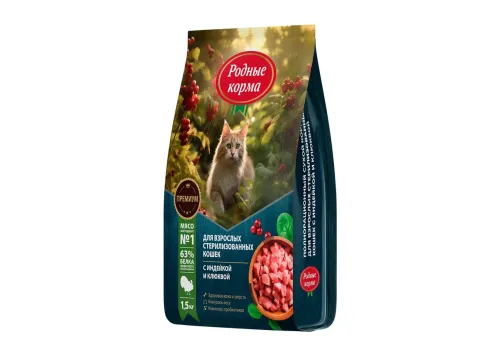 Родные Корма Сухой корм для взрослых стерилизованных кошек с Индейкой и клюквой 1,5 кг