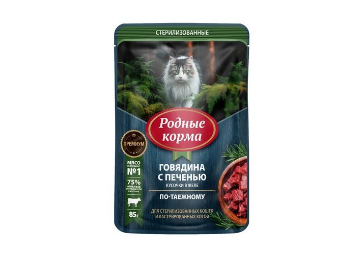 Родные Корма Паучи для Cтерилизованных кошек с Говядиной и печенью кусочки в желе по-Таежному (цена за упаковку) 85г х 30шт