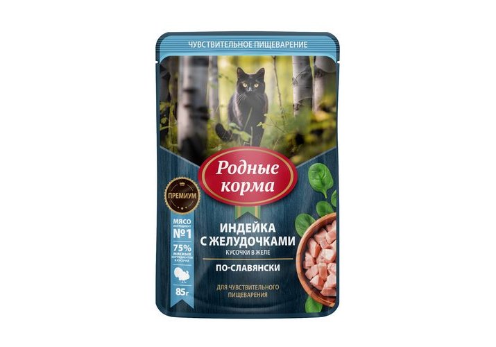 Родные Корма Паучи для кошек с Чувствительным пищеварением с Индейкой и желудочками кусочки в желе по-Славянски (цена за упаковку) 85г х 30шт