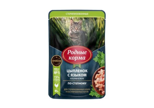 Родные Корма Паучи для Стерилизованных кошек с Цыпленком и языком кусочки в желе по-Степному (цена за упаковку) 85г х 30шт