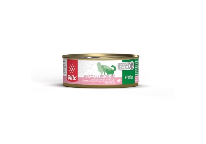 512Blitz Cat Vetline Hypoallergenic консервы для кошек100г. Ветеринарная диета показана при пищевой аллергии и атопическом дерматите. Способствует уменьшению проявлений аллергических реакций и улучшению состояния кожи и шерсти у кошек.