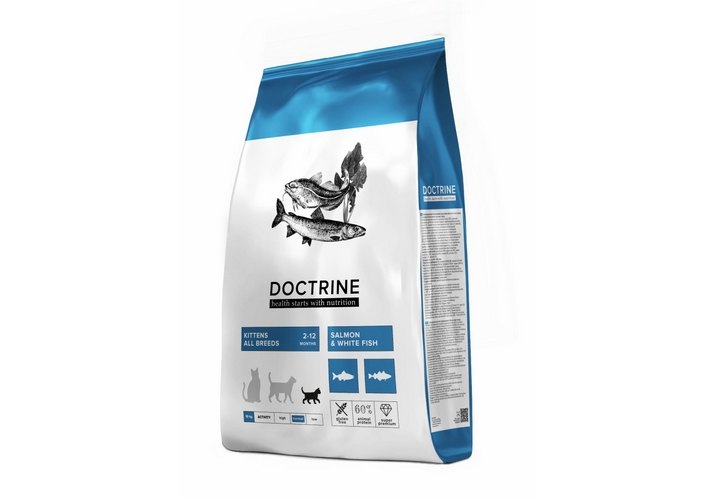 Суперпремиальный беззерновой рацион Doctrine для котят с лососем и белой рыбой тресковых пород. В суперпремиальном рационе Doctrine для котят мы реализовали доктрину правильного питания. Лосось и тресковые породы рыб богаты белком, полезными жирами, витаминами, макро- и микроэлементами. Картофель, цельный горох, сахарная свекла и морковь отвечают за пищеварение котенка. А шпинат насыщает организм малыша железом и антиоксидантами. И, конечно, никакого глютена!