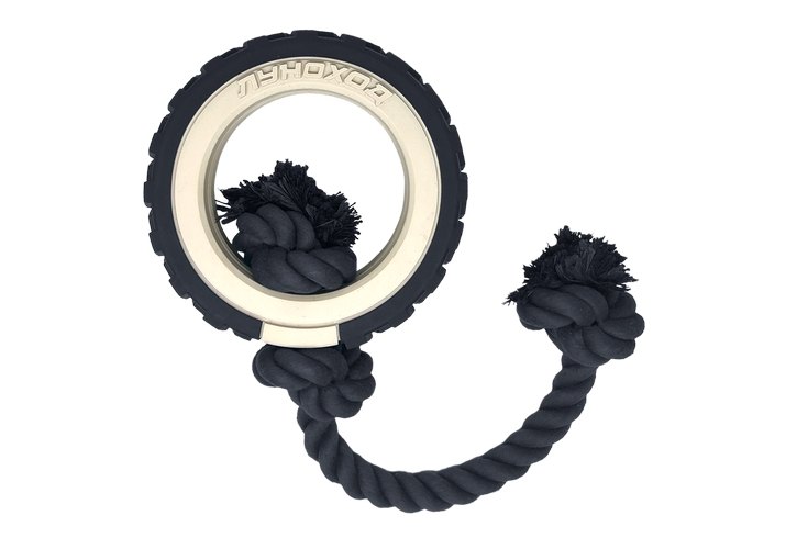 Очень прочное колесо из натурального каучука повышенной стойкости на канате для самых крупных и сильных собак. Идеально для игры в перетяжку.