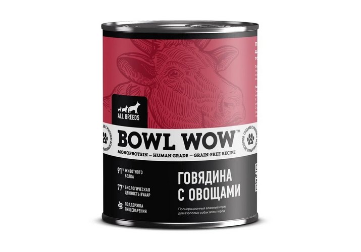 BOWL WOW Влажный корм Боул Вау для собак всех пород Говядина с овощами (цена за упаковку) 850 г