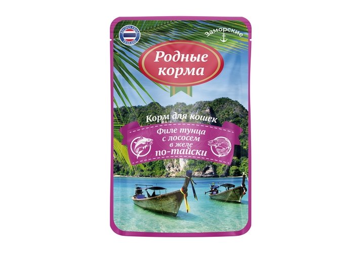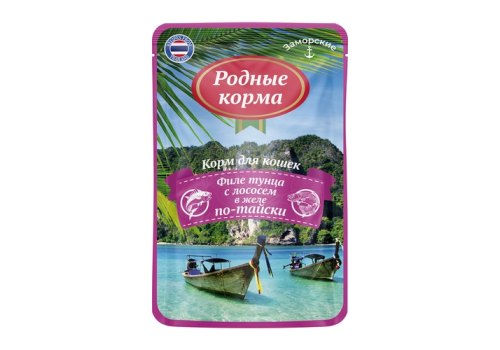 Родные Корма Паучи Заморские для кошек Тунец с лососем в желе по-тайски (цена за упаковку) 70г х 16шт