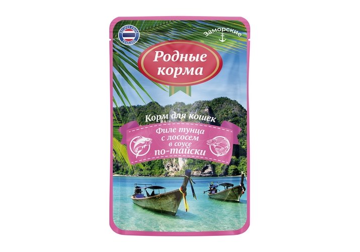 Родные Корма Паучи Заморские для кошек Тунец с лососем в соусе по-тайски (цена за упаковку) 70г х 16шт