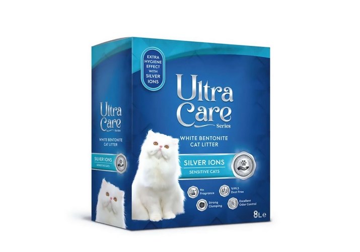 Ultra Care Silver Ions - супер премиум наполнитель для кошачьего туалета без ароматизатора. Подходит для чувствительных кошек. Белая бентонитовая глина и ионы серебра блокируют запах и предотвращают развитие бактерий. Обеспылен на 99,5%. Не прилипает к лапам. Легко образует комочки. Подходит для долговременного использования. Отсутствие ароматизатора специально для для чувствительных кошек Ионы серебра предотвращают распространение бактерий Инструкция: Насыпьте наполнитель в кошачий лоток на высоту от 7 до 10 см. Ежедневно удаляйте фекалии и образовавшиеся комочки. По мере необходимости досыпайте наполнитель до минимального уровня, чтобы предотвратить прилипание нижнего слоя к лотку. Использованный наполнитель выбрасывайте в мусорное ведро. Не смывайте наполнитель и отходы из кошачьего лотка в унитаз.