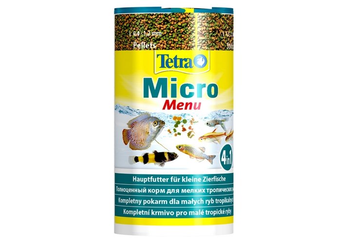 Тетра Микро Меню - смесь полноценных кормов для декоративных рыб небольшого размера, которые питаются в верхних, средних и нижних слоях воды. Диаметр корма варьируется в пределах от 0,3 до 2,5 мм в зависимости от его типа (чипсы, гранулы, пеллеты или палочки), а его сбалансированная формула содержит питательные вещества исключительно высокого качества. Более того, экструдаты красного цвета помогают усилить яркость естественной окраски, а зеленого — поддерживают здоровье и жизненные силы рыб. Маленькие экструдаты быстро размокают в воде, упрощая процесс приема пищи. Они обладают по-настоящему высокой степенью усвояемости, что помогает поддерживать чистоту воды. В общем и целом, Тетра Микро Меню - это идеальная смесь полноценных кормов для всех видов небольших декоративных рыб, молодых, растущих цихлид и морских рыб.