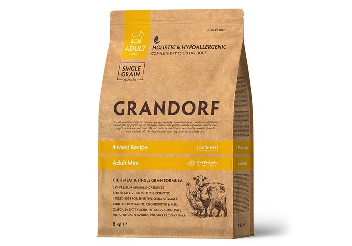 Grandorf Holistic & Hypoallergenic Mini Probiotic 4 meat Сухой корм Грандорф Низкозерновой с Живыми Пробиотиками для собак Мелких пород 4 Мяса с рисом 8 кг