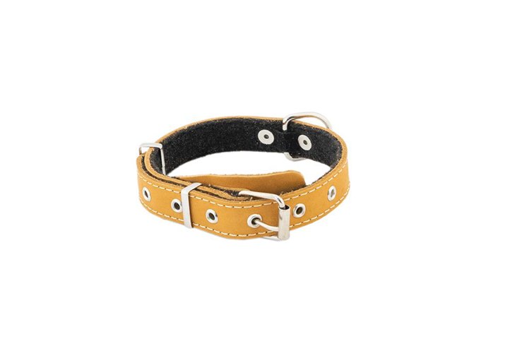 Ошейник изготовлен из добротной натуральной шорно-седельной кожи с мягкой подкладкой из фетра для смягчения воздействия ошейника на шею собаки и декоративной отсрочкой прочной нитью. Для крепления поводка в конструкции ошейника имеется цельносварное никелированное металлическое полукольцо усиленной серии, закрепленное посередине длины ошейника. Под пряжкой установлен кожаный "язычок" - для смягчения давления пряжки на шею собаки. Регулировочные отверстия усилены металлическими вставками-блочками. Для заправки кончика ошейника установлены две металлические рамки-шлевки. Ширина ошейника 20мм, длина (обхват шеи собаки) регулируется в диапазоне 28-40см* (*фактический размер может отличаться в пределах 1см). Подходит для ежедневного выгула животного.