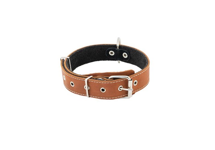 Ошейник изготовлен из добротной натуральной шорно-седельной кожи с мягкой подкладкой из фетра для смягчения воздействия ошейника на шею собаки и декоративной отсрочкой прочной нитью. Для крепления поводка в конструкции ошейника имеется цельносварное никелированное металлическое полукольцо усиленной серии, закрепленное посередине длины ошейника. Под пряжкой установлен кожаный "язычок" - для смягчения давления пряжки на шею собаки. Регулировочные отверстия усилены металлическими вставками-блочками. Для заправки кончика ошейника установлены две металлические рамки-шлевки. Ширина ошейника 35мм, длина (обхват шеи собаки) регулируется в диапазоне 45-60см* (*фактический размер может отличаться в пределах 1см). Подходит для ежедневного выгула животного.