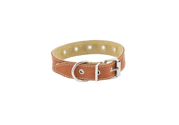 Ошейник изготовлен из двух слоёв натуральной кожи - шорно-седельной кожи с лицевой стороны и подкладочным слоем из натуральной кожи бежевого цвета с замшевой отделкой, благодаря чему обладает повышенной прочностью. Ошейник украшен декоративной отсрочкой прочной нитью. Для крепления поводка в конструкции ошейника имеется цельносварное никелированное металлическое полукольцо усиленной серии, установленное около пряжки. По всей длине ошейника размещены регулировочные отверстия, усиленные металлическими вставками-блочками, для регулировки по длине и придаёт ошейнику нарядный внешний вид. Ширина ошейника 30мм, длина (обхват шеи собаки) регулируется в широком диапазоне до 52см* (*фактический размер может отличаться в пределах 1см)
