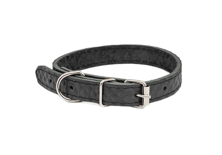 Ошейник для собак изготовлен из тиснёной натуральной шорно-седельной кожи. Для крепления поводка в конструкции ошейника имеется металлическое полукольцо, а для заправки кончика установлены две металлические рамки-шлёвки. Подходит для ежедневного выгула животного. Ошейники HOMEPET имеют широкий размерный ряд. Выпускаются в трех цветах:черный, коричневый и янтарь.