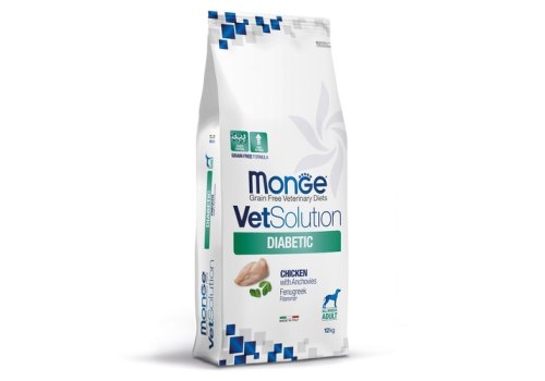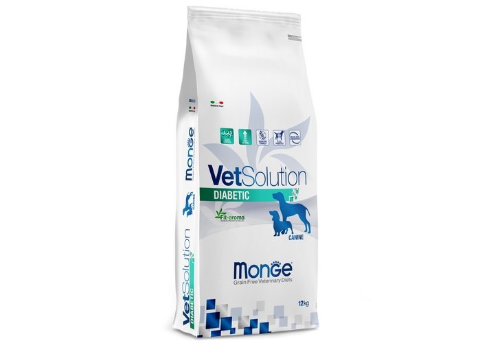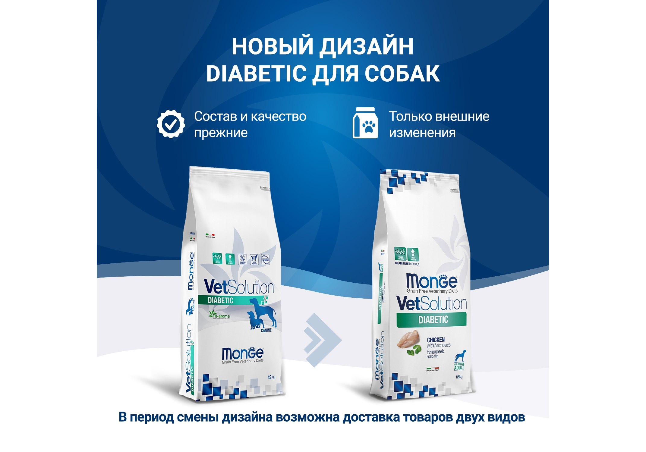 Monge VetSolution Diabetic Canine — полнорационный сухой диетический корм из курицы для собак «Diabetic» для контроля поступления глюкозы (при сахарном диабете) у собак.