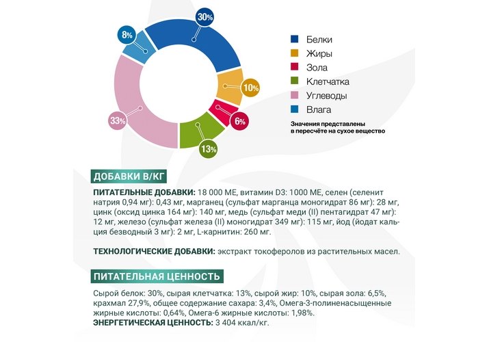 Питательные добавки в кг: витамин А (ретинола ацетат): 18 000 МЕ, витамин D3: 1000 МЕ, селен (селенит натрия 0,25 мг): 0,11 мг, марганец (сульфат марганца моногидрат 72 мг): 23 мг, медь (сульфат меди (II) пентагидрат 36 мг): 9 мг, железо (сульфат железа (II) моногидрат 234 мг): 77 мг, йод (йодат кальция безводный 6.8 мг): 4.45 мг, L-карнитин: 260 мг.