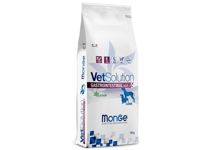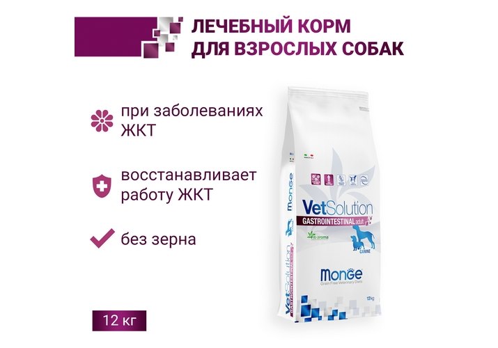 Лечебный корм Monge (Монж) VetSolution Dog Gastrointestinal для собак Гастроинтестинал при заболеваниях желудочно-кишечного тракта, таких как острый и хронический гастрит, расстройства моторики желудка энтерит и воспалительные заболевания кишечника, энтеропатии с потерей белка, синдром короткой кишки и избыточный бактериальный рост в тонком отделе кишечника, колит, а так же при остром и хроническом панкреатите (для собак, НЕ страдающих ожирением и гипертриглицеридемией).