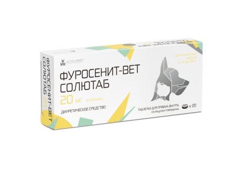 Показания к применению: Фуросенит-вет Солютаб применяют кошкам и собакам при отечном синдроме различной этиологии, в том числе: при хронической сердечной и почечной недостаточности, при нефротическом синдроме, при заболеваниях печени, при тяжелых формах артериальной гипертензии, при других заболеваниях, сопровождающихся отеками.