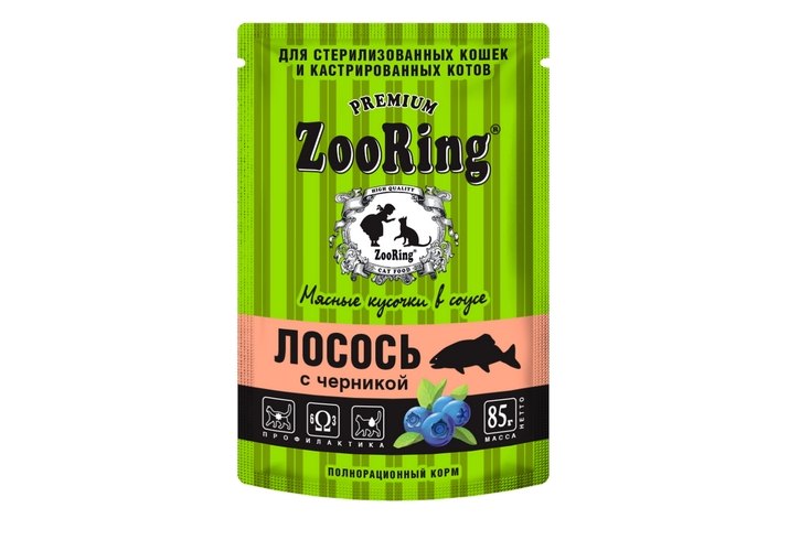 ZooRing Влажный корм Зооринг Паучи для кошек Мясные кусочки в соусе Лосось с черникой (цена за упаковку) 85 г х 26 шт