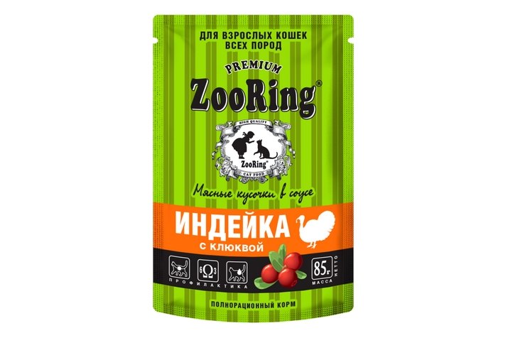 ZooRing Влажный корм Зооринг Паучи для стеризованных кошек Мясные кусочки в соусе Индейка с клюквой (цена за упаковку) 85 г х 26 шт