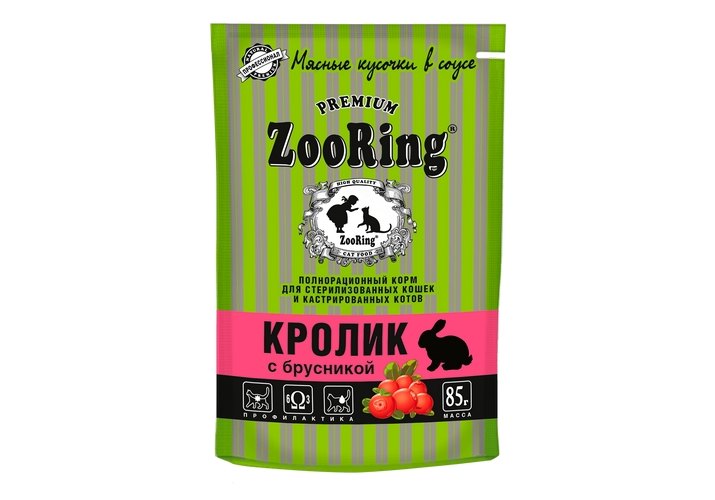 ZooRing Влажный корм Зооринг Паучи для стеризованных кошек Мясные кусочки в соусе Кролик с брусникой (цена за упаковку) 85 г х 26 шт