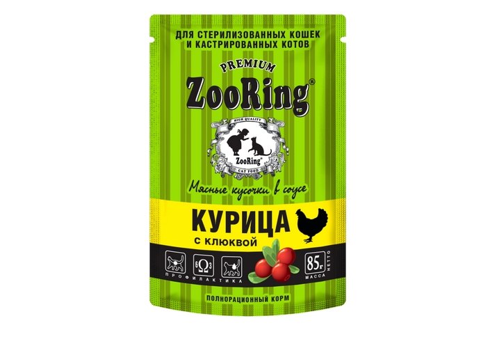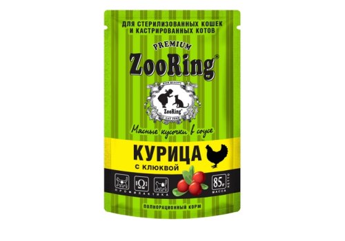 ZooRing Влажный корм Зооринг Паучи для стеризованных кошек Мясные кусочки в соусе Курица с клюквой (цена за упаковку) 85 г х 26 шт