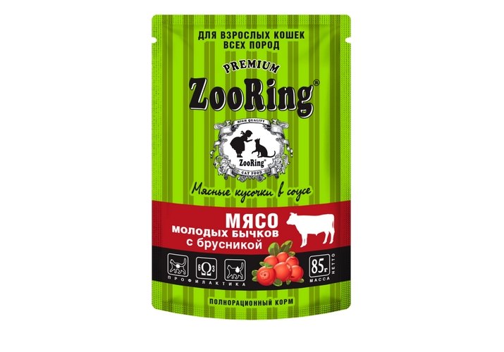 ZooRing Влажный корм Зооринг Паучи для стеризованных кошек Мясные кусочки в соусе Мясо молодых бычков с брусникой (цена за упаковку) 85 г х 26 шт