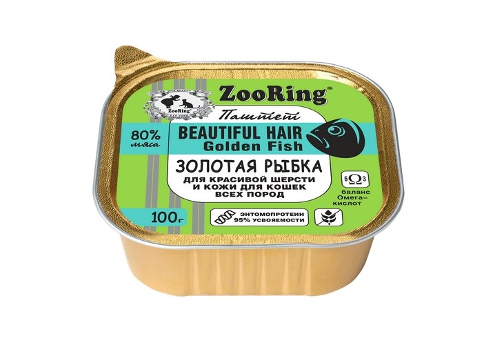 Zooring Cat Beauyiful Hair Gokden Fish Паштет Зооринг для кошек для красивой шерсти и кожи Золотая рыбка (цена за упаковку) 100 г х 16 шт
