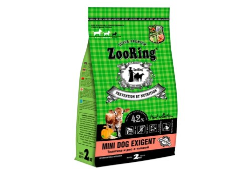 ZooRing Mini Dog Exigent Сухой корм Зооринг для взрослых привередливых собак мини пород Телятина и Рис с тыквой 2 кг