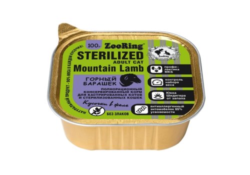 Zooring Консервы Зооринг для стерилизованных кошек кусочки в желе Горный барашек (цена за упаковку) 100 г х 16 шт