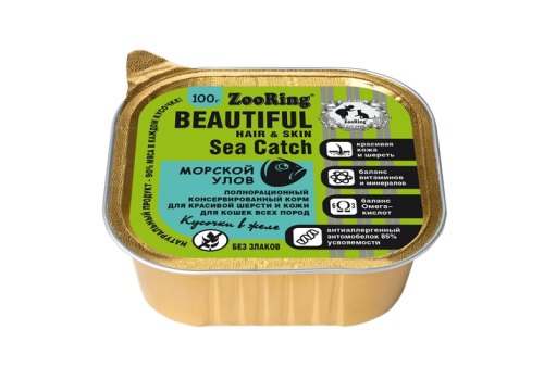 Zooring Консервы Зооринг для кошек для Красивой шерсти и кожи кусочки в желе Морской улов (цена за упаковку) 100 г х 16 шт
