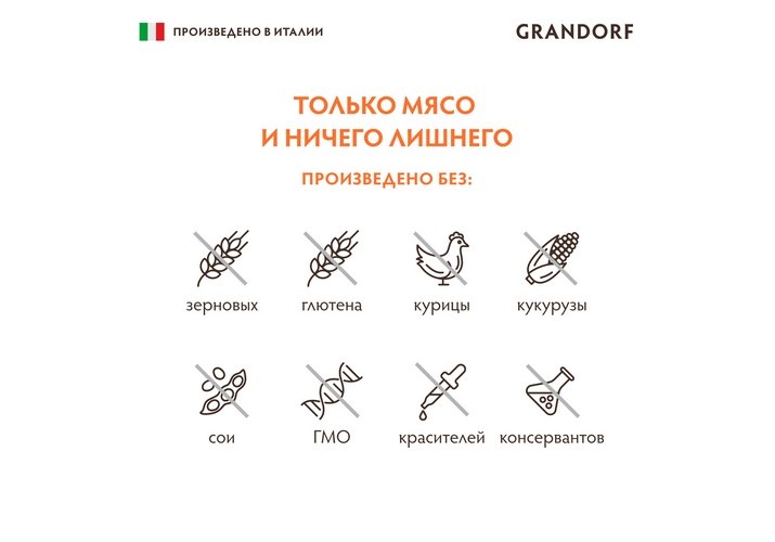 Все влажные корма GRANDORF основаны на мясе и содержат только высококачественные животные белки. Животный белок очень ценен и содержит все незаменимые аминокислоты для вашего питомца и полностью удовлетворит его биологические потребности в мясном питании.