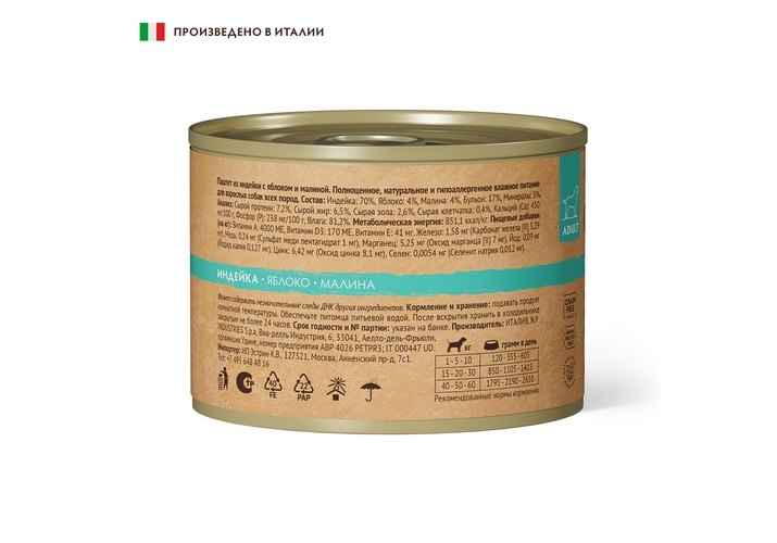 Состав: Индейка: 70%, Яблоко: 4%, Малина: 4%, Бульон: 17%, Минералы: 5%.