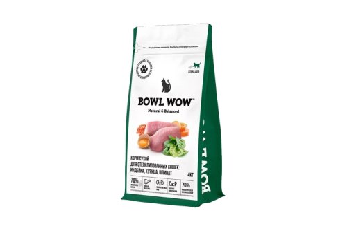 BOWL WOW Сухой корм Боул Вау для Стерилизованных кошек с Индейкой курицей и шпинатом 4 кг