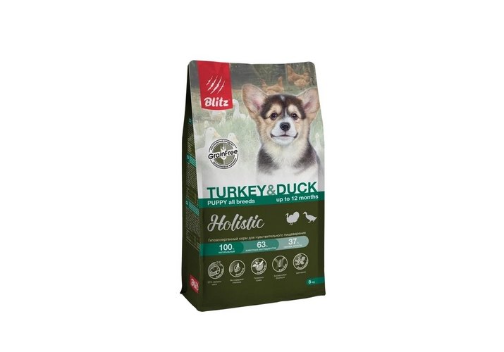 Blitz Holistic All Puppy Breeds Turkey & Duck Сухой Беззерновой корм Блиц для щенят, беременных и кормящих собак Индейка Утка 8 кг
