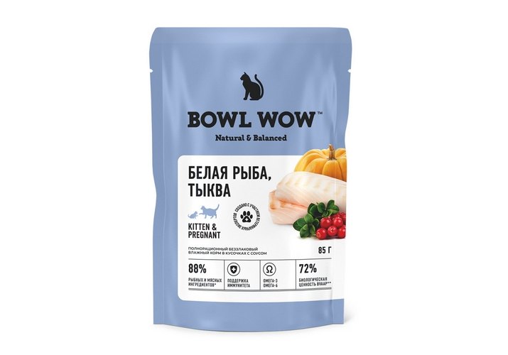 BOWL WOW Влажный корм Боул Вау для котят и беременных кошек Белая рыба с тыквой в соусе (цена за упаковку) 85г х 12шт