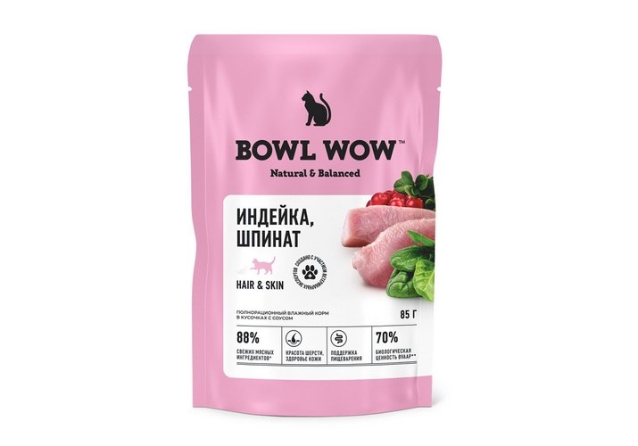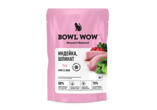 BOWL WOW Влажный корм Боул Вау для взрослых кошек здоровье кожи и шерсти Индейка со шпинатом в соусе (цена за упаковку) 85г х 12шт