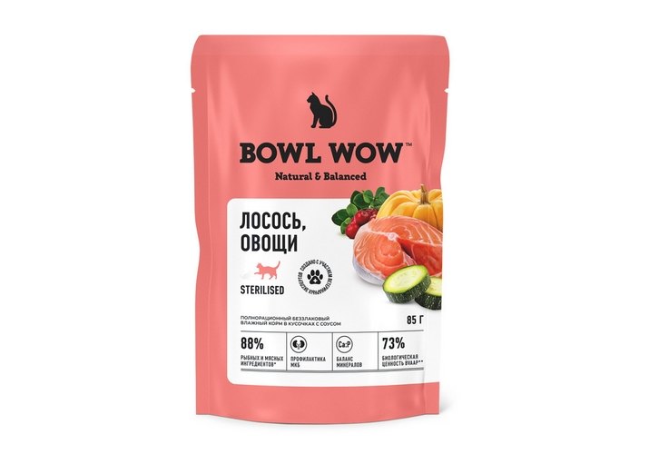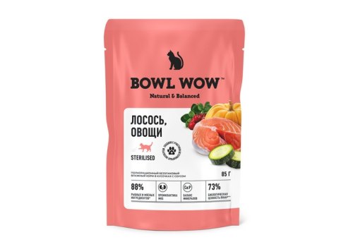 BOWL WOW Влажный корм Боул Вау для взрослых стерилизованных кошек Лосось с овощами в соусе (цена за упаковку) 85г х 12шт