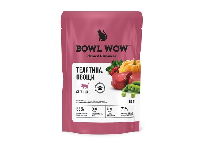 BOWL WOW Влажный корм Боул Вау для взрослых стерилизованных кошек Телятина с овощами в соусе (цена за упаковку) 85г х 12шт