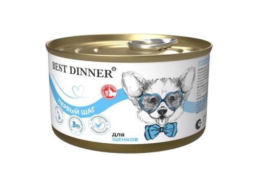 Рацион разработан с учетом физиологических особенностей щенков. Мясо курицы, куриные яйца и молоко являются отличными легкоусваиваемыми источниками незаменимых аминокислот и полноценных белков, необходимых для здорового роста и развития щенка. Рацион дополнен жирными кислотами для поддержания правильного развития неврной системы щенка. Нежная текстура облегчает первый прикорм. Best Dinner "Первый шаг" изготовлен только из натуральных ингредиентов без искусственных красителей, консервантов и ароматизаторов, обогащен всеми необходимыми витаминами и минеральными веществами.