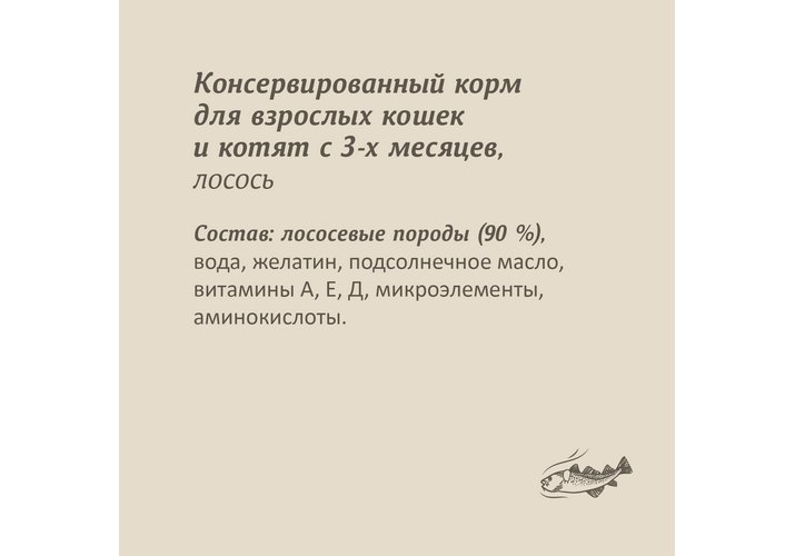 Состав: лососевые породы 90%, вода 9,2%, желатин 0,8%, подсолнечное масло 0,01%, витамины А,Е,D, микроэлементы, аминокислоты.